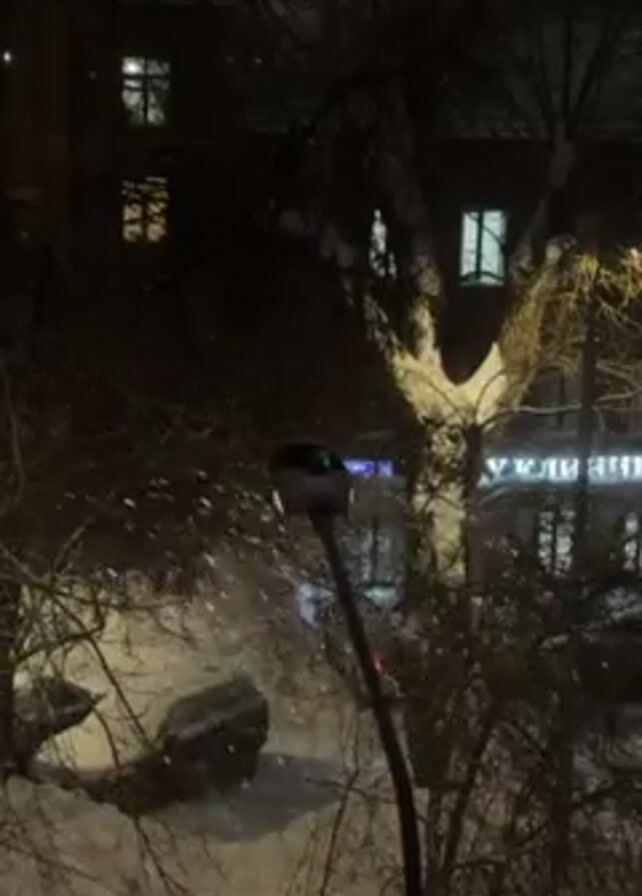 It is nighttime and snowing in an urban area. A street lamp is visible in the center of the frame, with snow falling around it. A building with several lit windows can be seen in the background. Bare tree branches frame the scene. There is snow on the ground.