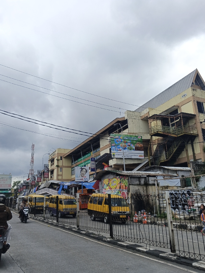 The image depicts an urban street scene in front of the Palayan City Public Market Complex in Palayan, Philippines, under an overcast sky. A paved asphalt road occupies the lower left and central portions of the frame, bordered on the right by a low black metal fence. Several vehicles are present: a person wearing a brown jacket and helmet rides a motorcycle away from the viewer on the left side of the road, followed by another motorcycle. To the right, along the curb, a line of yellow passenger vans with blue trim, resembling mini-jeepneys, are either parked or slowly moving. Orange traffic cones are visible on the ground behind the fence. Dominating the right side of the image is a multi-story commercial building complex. The building on the far right features a prominent gray gable roof, light yellow walls, and several external balconies with metal railings, connected by an external metal staircase. Further left, additional sections of the complex display multiple large billboards and signs, including advertisements for consumer goods, food products, and one featuring a smiling child. Below these structures, at street level, are smaller, makeshift market stalls constructed from corrugated metal and tarpaulins, one of which displays a large banner with images of fruits and vegetables. Numerous black electrical wires traverse the upper half of the image against the cloudy sky. In the mid-distance on the left, a red and white striped telecommunications tower is visible above the buildings. A few indistinct human figures are discernible on the far right near the fence and market stalls.