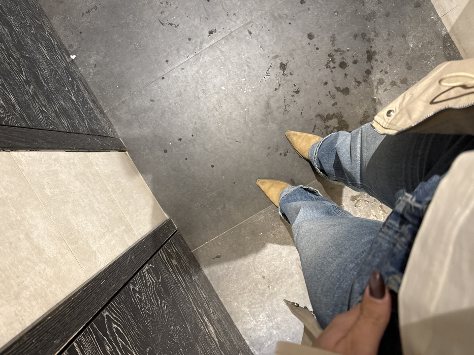 The image, captured from an overhead perspective in an indoor setting in Cannes, France, focuses on the lower body of an individual. The person is wearing light blue jeans with frayed cuffs and tan, pointed-toe boots. A hand with dark-polished fingernails is visible on the left leg. Portions of a light-colored outer garment, likely a jacket, are visible on the periphery of the frame, with a snap closure and a subtle design element visible on the right side. The floor is composed of dark grey tiles, exhibiting numerous scuffs and irregular dark stains. In the background, dark, wood-grained partition walls flank a section of lighter beige tiled wall.
