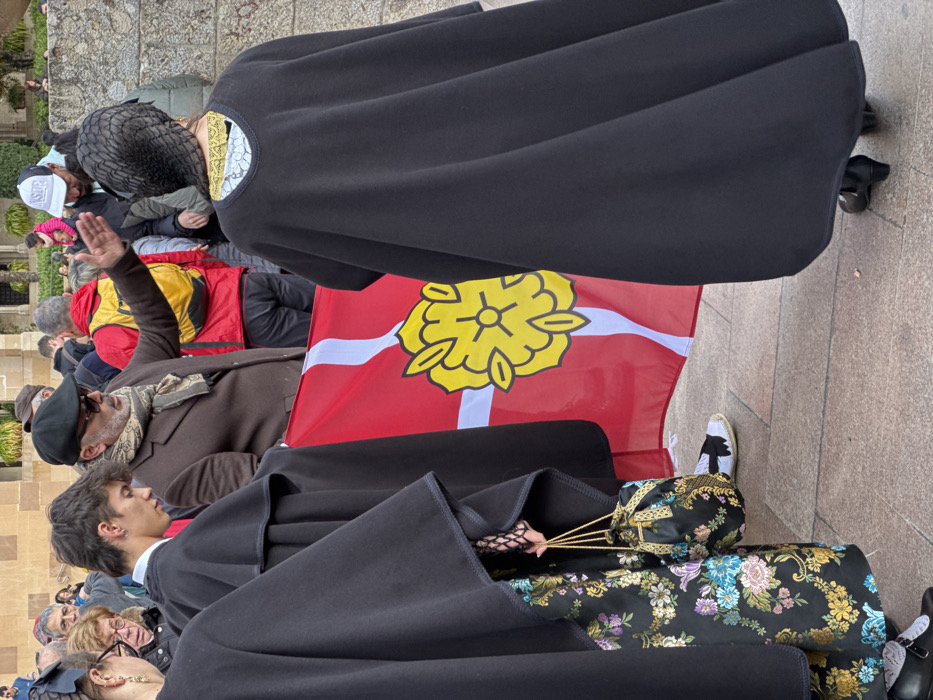 The scene depicts an outdoor public gathering in Monistrol de Montserrat, Spain, under daylight conditions. The foreground features four individuals in various states of visibility and interaction, positioned on a paved stone surface. To the left, a woman is partially visible from the mid-torso down. She wears a long black cape over a full skirt or dress patterned with large blue, purple, green, and gold floral motifs on a dark background. Her left hand, encased in a dark, possibly netted glove, holds a small, black drawstring bag with gold accents and matching floral patterns. She wears black shoes with white decorated socks. Next to her, a young male stands facing slightly left, with his head tilted downwards. He wears a black cape over a white collared shirt. His left foot, clad in a black and white patterned espadrille, is visible. In the center, an adult male stands facing right, actively gesturing with his open right hand, palm towards the right. He wears a dark brown peaked cap, dark sunglasses, a brown overcoat or jacket, and a patterned scarf around his neck. He has a beard. To the right, a woman is seen from behind, primarily covered by a long black cape. The top edge of a white and yellow patterned garment is visible at her neckline beneath the cape. She wears a black, possibly netted, head covering. Her black shoes with heels are visible at the bottom of the frame. A large red flag with a prominent white cross and a central yellow rose design, outlined in a darker color, is vertically positioned in the lower-center of the frame, separating the young man and the woman on the right. The flag appears slightly wrinkled. The background shows a crowded public space with numerous indistinct figures. Behind them, light brown stone buildings with arches and some greenery are visible. The ground throughout the visible area is paved with rectangular stone or concrete slabs.