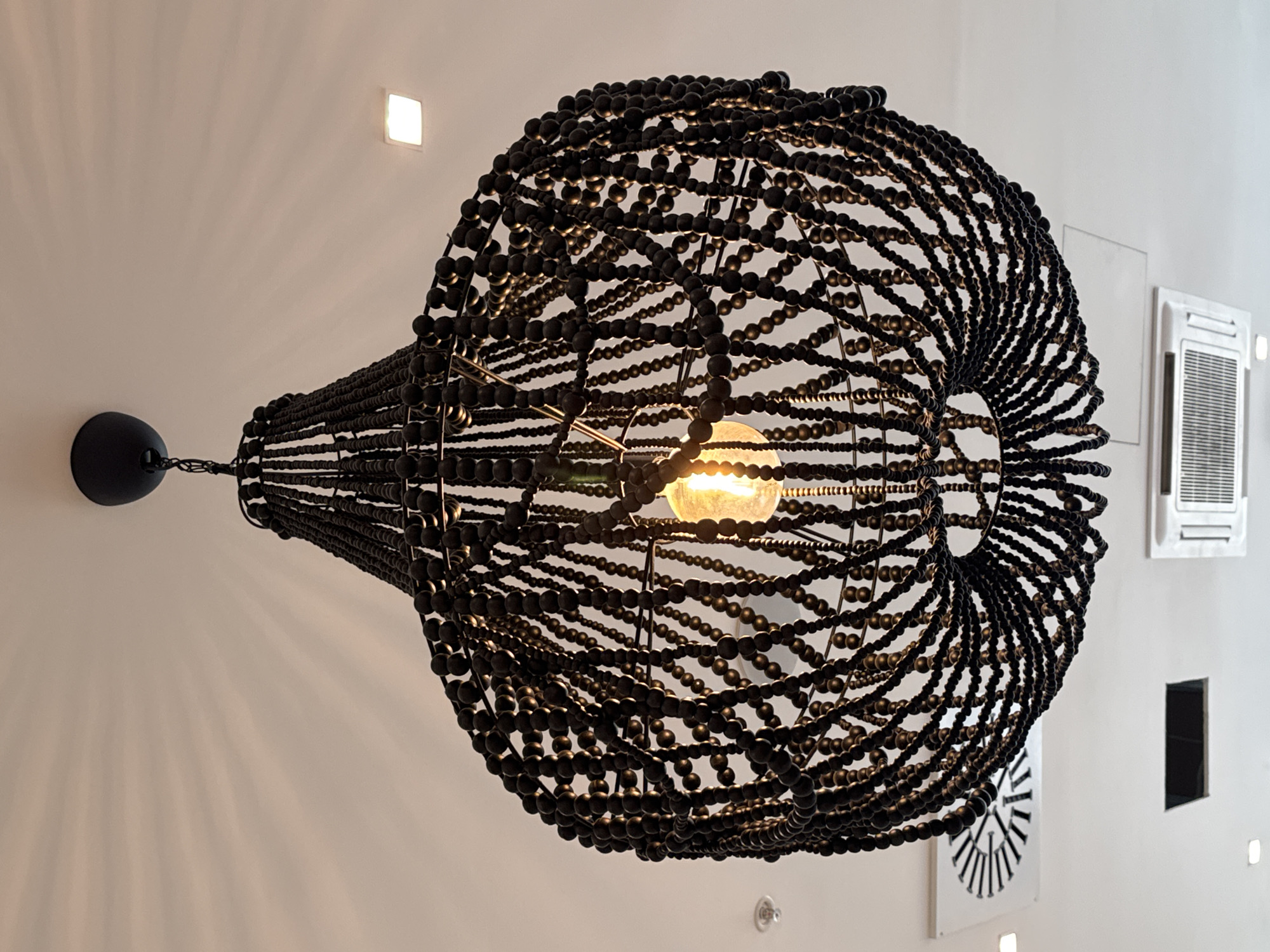The image displays a low-angle view of a large, spherical chandelier made of numerous dark, possibly black, wooden beads. The beads are strung to form a multi-layered, open-weave structure. A single, exposed incandescent light bulb with a visible filament, emitting warm yellow light, is positioned centrally within the chandelier. The chandelier hangs from a dark, circular ceiling mount by a chain. Distinct radial shadows are cast by the chandelier onto the light-colored ceiling above. The ceiling, appearing off-white or light beige, features several fixtures: - A square, illuminated recessed LED light is visible in the upper right quadrant. - A white, circular smoke detector or sprinkler head is located in the upper left quadrant. - A white air vent with a circular design of radial spokes is present in the lower left. - A white, rectangular air conditioning unit with a visible grille is situated in the lower right. - A dark, rectangular recessed opening, likely another vent or an access panel, is positioned towards the bottom center. - Additional unlit recessed lights are visible in the background. This scene is located within Kitchen 59 (Kitchen 59 food & drinks), at bul. 'Vitosha' 59, Sofia, Bulgaria.