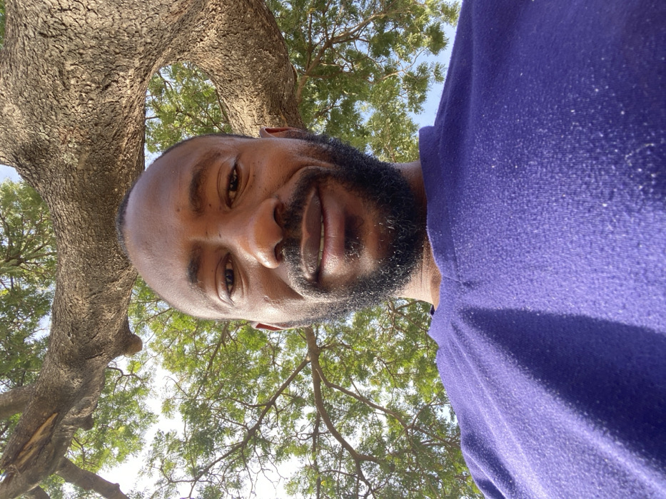 A man with dark skin, a beard, and short hair looks upward into the camera. He wears a purple shirt. Above him, a large tree with green leaves spreads its branches, creating a canopy effect against the bright sky. The perspective is angled, giving the impression the man is looking up from below the tree. The lighting is bright.
