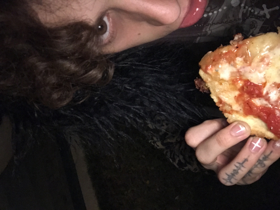 A close-up captures a person holding a slice of pizza. The individual has brown, curly hair, visible facial features including an eye, nose, and mouth with glossy lips. They appear to be wearing a dark fuzzy garment. Tattoos are visible on their fingers and hand, and their nails are painted with white crosses. The pizza slice has a thick crust and is topped with cheese and tomato sauce. The lighting appears dim, and the background is dark.