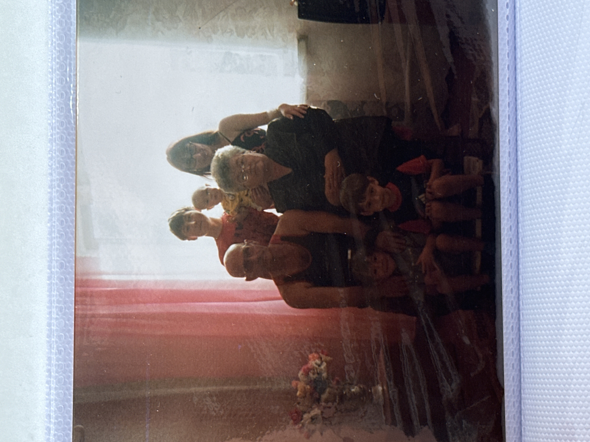 A photograph shows a group of seven individuals posing together indoors. A woman with glasses is positioned towards the center, with others grouped around her. Their clothing appears to be casual. In the background, there's a window with a pink curtain and a bouquet of flowers on the floor. The photo is housed in a photo album. There is no evidence in the photograph to indicate the city of Aktanysh, Russia.