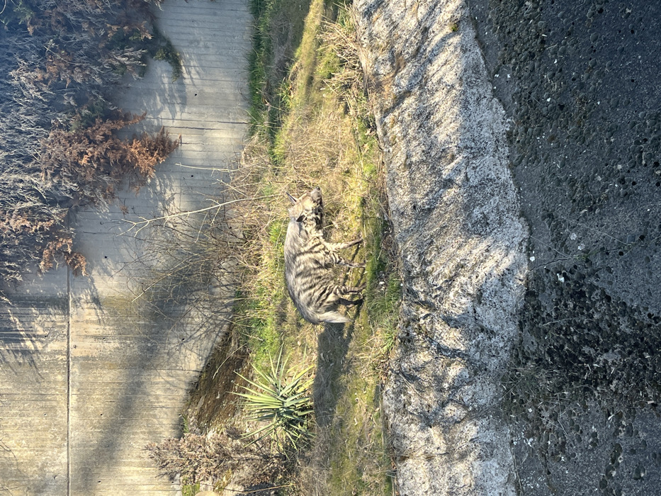 - "An adult striped hyena (Hyaena hyaena) is observed walking from left to right across a sunlit outdoor enclosure, with its head slightly lowered, appearing to scan or sniff the ground" by FM-Pur1n2, licensed under CC BY 4.0