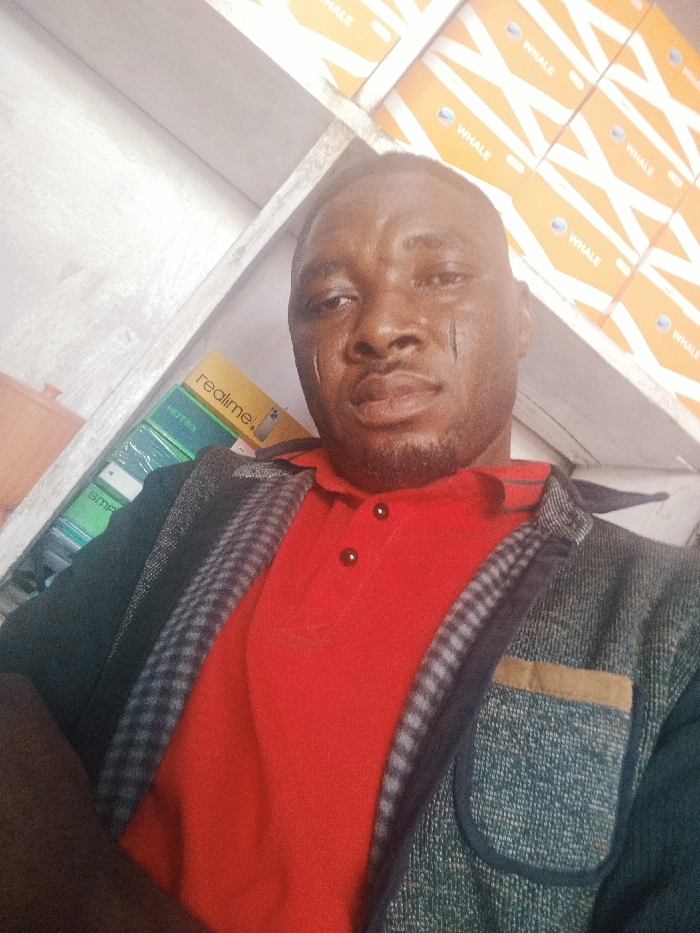 An adult male with dark skin and short, dark hair is depicted in a portrait-style image, taken indoors in a commercial establishment within Fagge A, Nigeria