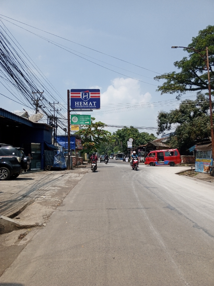 The image depicts a street scene in Multhan, India, under a clear sky with scattered white clouds. A two-lane asphalt road, exhibiting moderate wear and faint white lane markings, recedes into the background. On the left, a concrete sidewalk abuts the road. A black SUV is partially visible, parked on the sidewalk, with one individual near its front. Adjacent to the SUV, a dark-colored building with an awning is present. A utility pole with a dense cluster of black cables stands on the left. A prominent sign structure displays a blue and red sign with "HEMAT TOKO SERBA GUNA & GROSIR" and an "H" logo, followed by a smaller green sign with "ATM" pointing right, and another smaller yellow sign below it. Several motorcycles are in motion on the road: one red motorcycle with a rider in a red shirt is in the mid-left, and another red motorcycle with a rider in a white helmet and blue shirt is in the mid-right. Additional motorcycles are visible further down the road. On the right side, a red minivan with blue lower body panels is parked, partially obscuring a building. Trees with green foliage and various other structures line both sides of the street in the distance. A streetlamp post is visible on the far right.