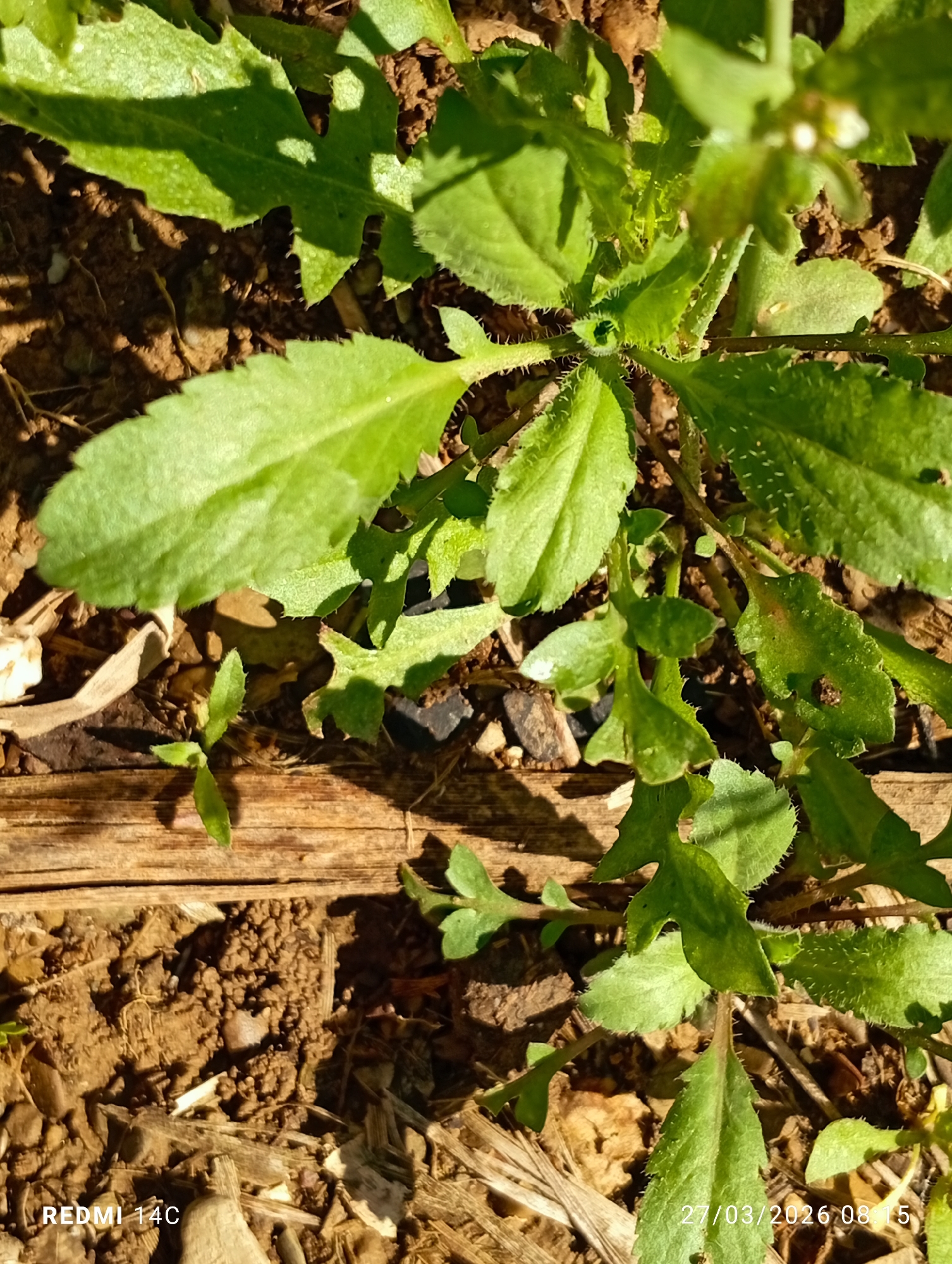 This image presents an overhead, close-up view of ground cover in Grhala, Pakistan. The scene consists primarily of multiple small, green herbaceous plants growing in reddish-brown, clumpy soil. The plants feature lobed or serrated leaves, some exhibiting fine, hair-like structures on their surfaces and stems. A few plants display small, white floral structures, particularly in the upper central and right areas, indicating flowering. A prominent, horizontally oriented piece of weathered wood or bark, approximately 20-25 cm in length, is situated across the lower-middle section of the frame, partially obscured by the growing foliage. Scattered throughout the soil are various fragments of dry organic debris and small stones. Strong, direct sunlight illuminates the scene from the upper left, casting distinct, dark shadows from the plants and the wooden element onto the soil, suggesting a clear, early morning outdoor environment. No human figures, animals, or artificial structures are present. The image was captured by a Redmi 14C device on March 27, 2026, at 08:15.