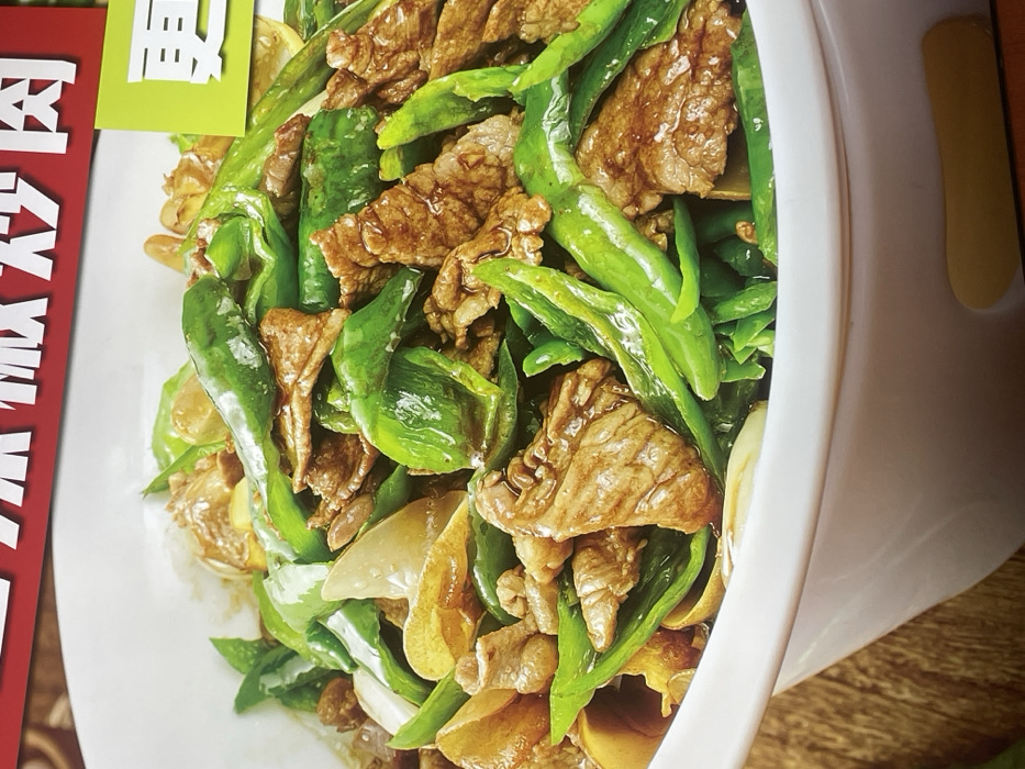 A close-up, high-angle image depicts a stir-fried dish, presumably "pepper stir-fried meat" (青椒炒肉), served in a white ceramic bowl