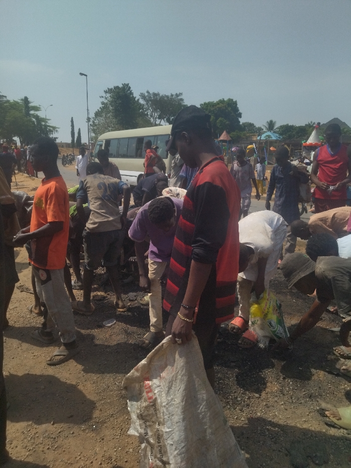 group of people gathered around a newly laid asphalt road in New Karu, Nigeria