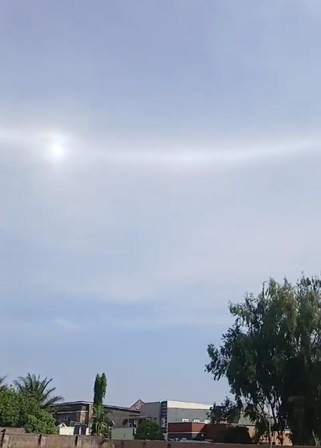 sky during the day. There is a distinct halo surrounding the sun. The camera pans across the sky, showing buildings, trees, and power lines. The sky is partly cloudy. There is speech audible in the background. The sun is very bright.