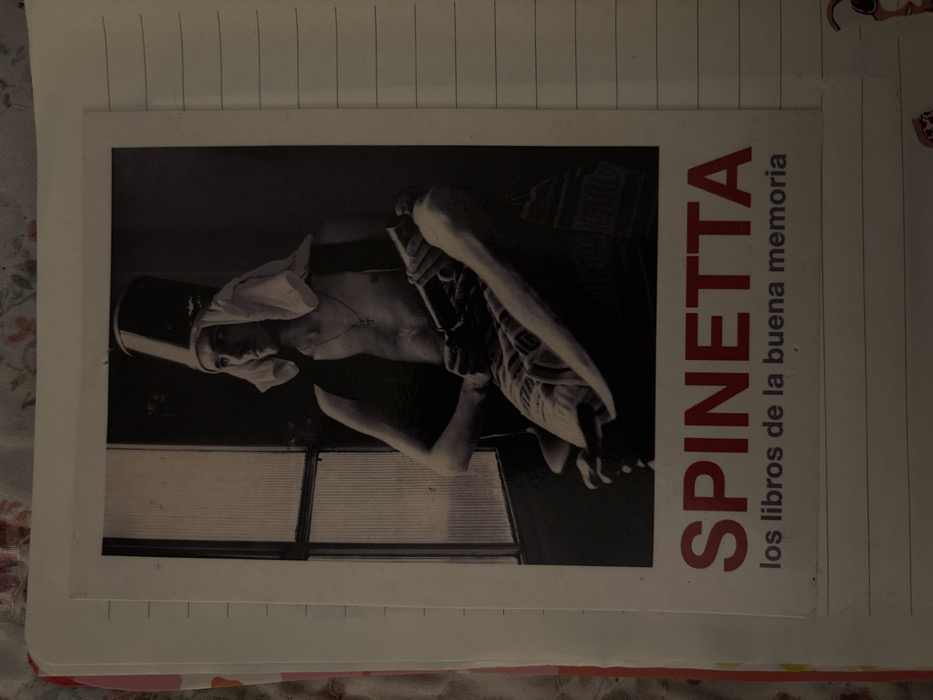 A monochrome image depicts a person, possibly male, wearing a bucket on their head draped with a white cloth. They are bare-chested with a cross necklace. Their legs are positioned oddly, as if twisted. A window with multiple panes sits in the background. The text "SPINETTA" in large red letters appears to the right, followed by smaller text in a different font that reads "los libros de la buena memoria". The image appears to be a book cover or promotional material.