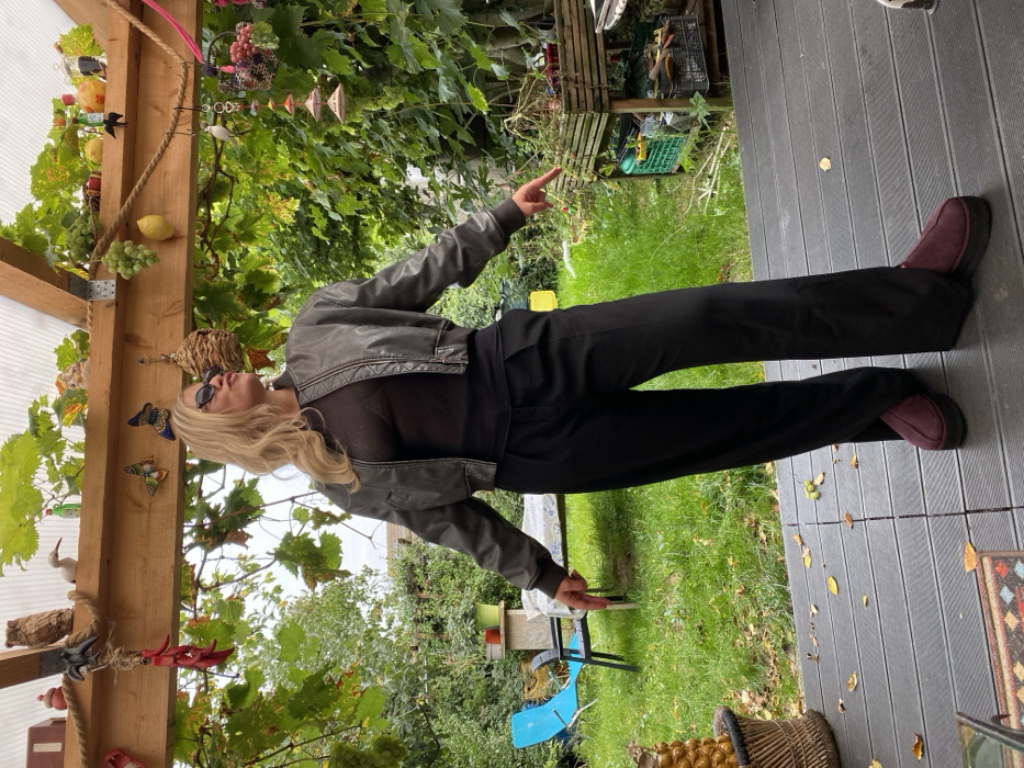 An adult blonde female is depicted posing outdoors on a dark grey composite deck in a residential garden located in Wattrelos, France. She wears dark sunglasses, a charcoal grey cropped bomber jacket over a sheer dark top, black wide-leg trousers, and maroon platform shoes. Her arms are slightly extended to her sides, palms open, with her head turned and tilted upwards, looking towards her right. Above her, a wooden pergola structure with a translucent roof panel is adorned with numerous decorative items, including artificial grapes (green and purple), lemons, bird figurines (owl, stork), butterflies, red chili peppers, woven baskets, and wind chimes, all partially obscured by natural green foliage, likely grapevines. The background consists of a green lawn. To the left, a light blue metal lounge chair and a dark chair are positioned behind a light-colored table. To the right, a wooden raised planter box or workbench holds various items, with dense green vegetation and trees beyond. Scattered yellow and brown leaves are present on the deck surface.