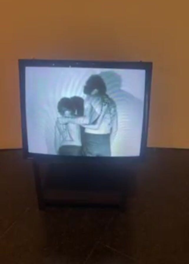 A television set sits on a black stand against a beige wall. The screen displays a black and white video. The image on the screen shows two people, one standing behind the other. The person in the back has their hand on the shoulder of the person in front. The image has an odd, wavy distortion pattern. The floor is dark.