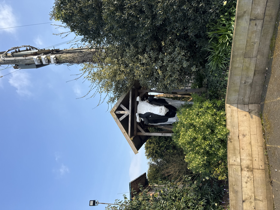 The image depicts a life-sized, black and white cow statue, identified as "Rosie the Cow," positioned within a rustic, open-sided wooden shelter with a pitched roof. This installation is located at Attwell's Farm Shop, Kidderminster, in the district of Wyre Forest, United Kingdom. The statue, featuring distinct black markings on its face and body, faces directly forward. It is surrounded by dense vegetation, including various green shrubs and bushes, some with lighter green or variegated foliage. In the foreground, a multi-tiered wooden retaining wall, constructed from horizontal timber planks, separates the planted area from a paved or graveled surface. To the left, a rectangular LED floodlight is mounted on a tall, thin pole, with a section of another wooden building visible in the background. To the right, a weathered wooden utility pole, partially covered by climbing vegetation and fitted with electrical components, rises against a clear, bright blue sky featuring scattered white clouds. No individuals or specific human activities are present in the scene.