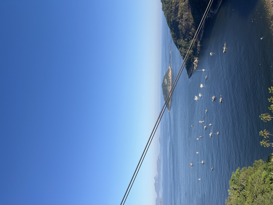 A scenic view features a cable car line stretching from the bottom left to the top right. Below, a deep blue body of water hosts numerous sailboats. Lush green cliffs and tropical vegetation line the water's edge on both sides. A small, narrow island sits in the distance. The sky is a clear, vibrant blue, offering a bright contrast to the darker water and greenery.
