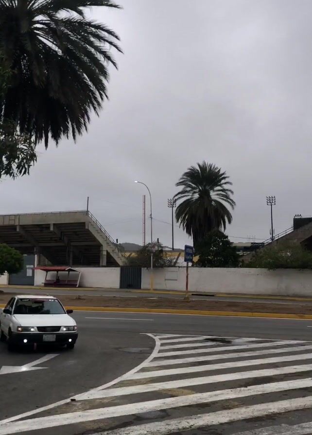 street scene. A large, blue metal gate is visible next to a tree. A car drives past the gate. The camera pans to show a stadium in the background with several advertisements and trees. A motorcycle drives by in the distance. The sky is overcast.