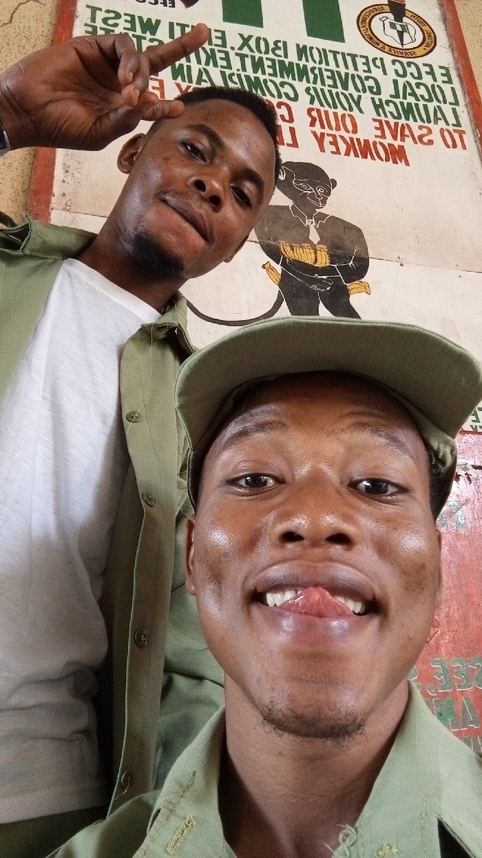 Two young adult males of dark complexion are depicted in a selfie taken in Aramoko-Ekiti, Nigeria, against a cream-colored wall