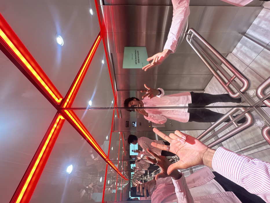 The image captures a male individual inside a modern, highly reflective interior space, located in Paris, France