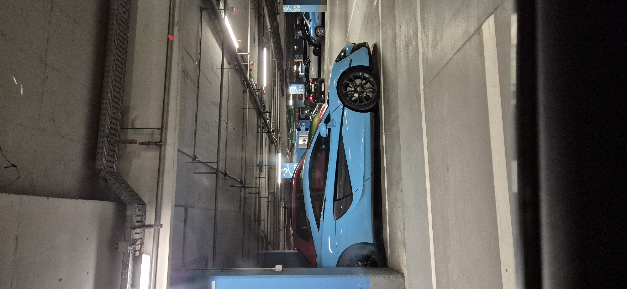 n underground parking garage. The focus is on a turquoise sports car parked in a space designated "-3", as indicated by a sign. Other vehicles are parked further down the row. The garage has concrete walls and ceilings, with pipes and electrical conduits running along the ceiling. The location is Sofia, Bulgaria.