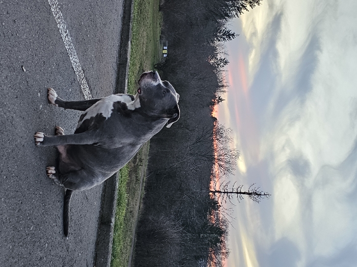 A brindle and white pitbull dog sits on asphalt in a parking lot, gazing upward. A painted white line is visible on the pavement to its left. Behind the dog is a grassy area and trees. In the background, a vibrant sunset paints the sky with hues of orange and gray. The overall scene evokes a sense of tranquility.