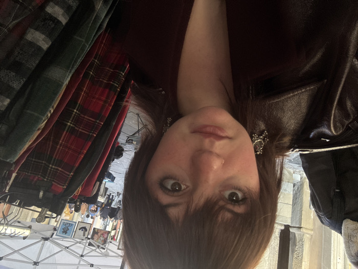 A close-up image depicts a female individual taking a direct-to-camera selfie within an outdoor market environment in Arezzo, Italy. The subject, with shoulder-length dark brown hair and bangs, possesses a light complexion and a small stud piercing in her right nostril. She wears a dark maroon or deep red garment beneath a shiny, dark brown or burgundy leather jacket and has distinctive silver-toned dangling earrings with a dark central element. To the subject's immediate left, the upper back and shoulder of another individual wearing a black jacket with a fur-lined collar are partially visible. Behind them, historic light-colored stone architecture featuring carved columns and arches is apparent, indicating a substantial building facade. The ground beneath this structure appears to be paved with flagstones. To the subject's right, a retail display rack is prominent, holding multiple plaid skirts or kilts in patterns predominantly featuring red, green, and grey tartans. Beyond this display, white canopy tents characteristic of outdoor market stalls are visible. In the background, numerous pedestrians are present, suggesting a bustling market activity, and artwork or posters are displayed on some of the market tents. The scene is consistent with an outdoor market occurring in a historic urban square. Given the city of Arezzo, this location is identifiable as Piazza Grande, likely during its monthly antique market (Fiera Antiquaria) or another similar public event, with the architectural elements resembling those found around the square, such as the Logge del Vasari.