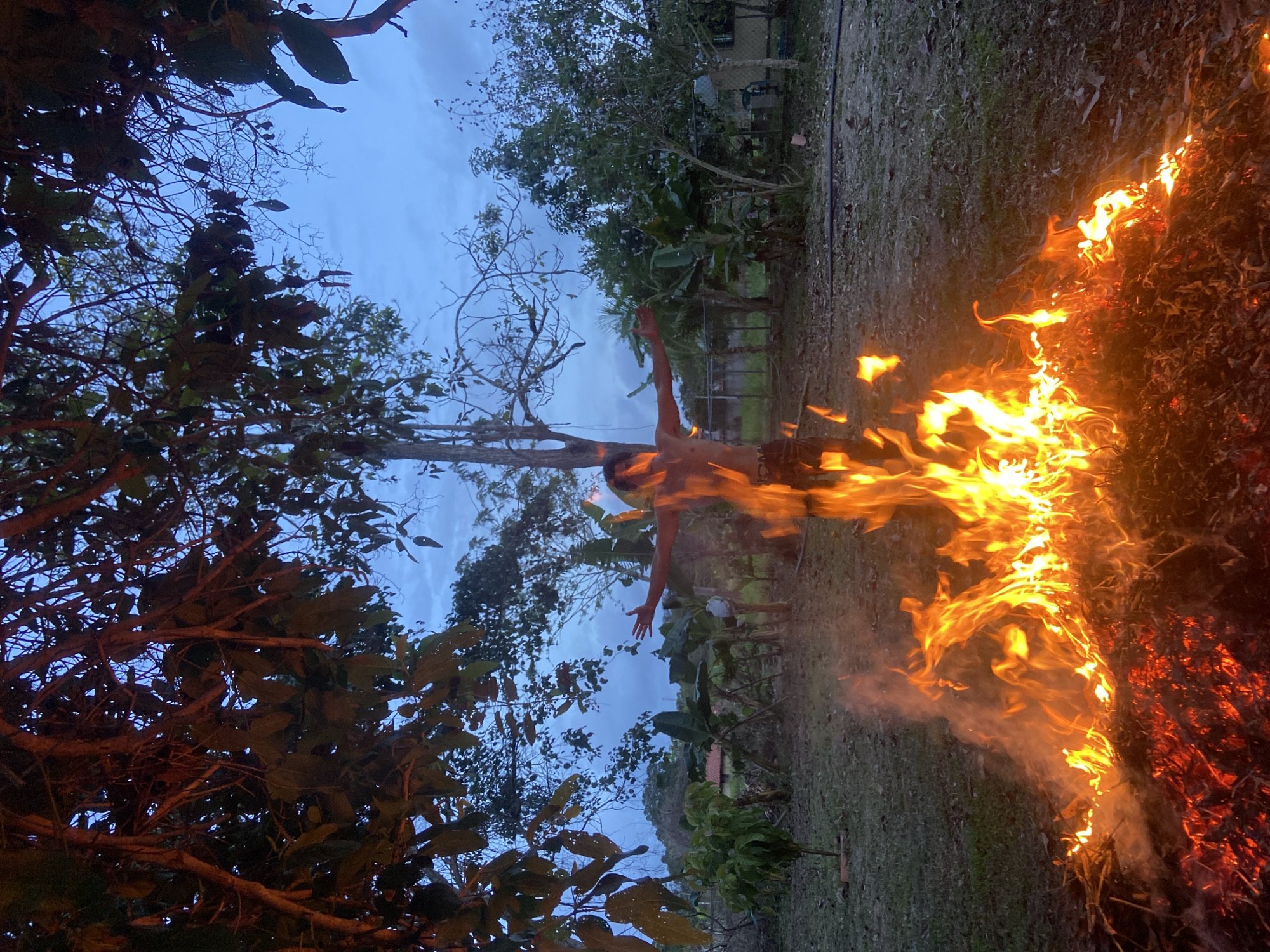 person standing near a large fire in an outdoor environment. The sky is visible in the background, suggesting it is dusk or dawn. Trees and foliage surround the area. The fire appears to be burning a pile of dry leaves and debris. The person has their arms outstretched, partially obscured by the flames. The specific location is Los Velásquez, Venezuela.