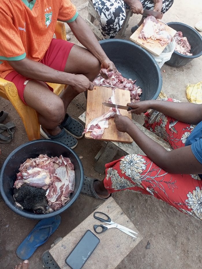 An outdoor scene in Unknown, Unknown, depicts four individuals engaged in cutting raw meat on a dirt ground under natural daylight. In the foreground-left, a male wearing an orange and green sports jersey (featuring an Ivory Coast crest), red shorts, and black clogs sits on a yellow plastic chair. He cuts raw meat on a large central wooden chopping board with a knife. To his right, a second person, wearing red floral-patterned pants and a blue shirt, also cuts meat on the same board using a different knife. In the upper right, a third individual, dressed in black and white patterned pants, uses a cleaver on a smaller wooden board. Hands of a fourth person are visible in the upper center, also handling meat. Raw meat, including cuts with bone and a piece of dark, matted animal fur (suggesting a goat or sheep carcass), is present on the cutting boards and within three black plastic buckets. The bucket in the lower-left contains larger meat portions and the piece of fur. The bucket in the upper-center holds numerous smaller, portioned meat pieces. On a small wooden plank in the lower-center, a pair of black-handled scissors and a dark-colored smartphone are placed. Additional items include a blue flip-flop and various black clogs on the packed earth ground.