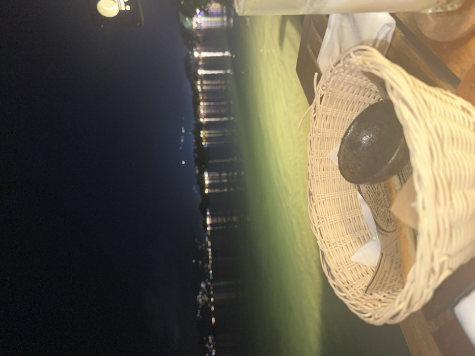 The image depicts a nighttime scene from a dining establishment overlooking a body of water in Choeng Mon, Thailand. In the immediate foreground, a light-colored woven wicker basket rests on a wooden table. The basket contains several pieces of bread, partially wrapped in newspaper-style paper, and a dark, oval-shaped object consistent with an avocado or dark bread roll. To the right of the basket, a clear glass holding a light-colored beverage is partially visible. The midground features a large body of water, likely a sea or bay, exhibiting a distinct greenish-yellow illumination across its surface, with numerous vertical reflections of distant lights. The background shows a distant shoreline characterized by a multitude of blurred artificial lights from buildings or establishments. The sky above is dark. A partial sign, featuring a light-colored circular or crescent logo on a dark background, is visible on the far right edge of the frame. No individuals are visible in the scene.