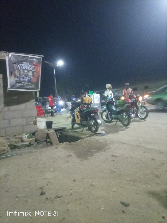 Night scene with parked motorcycles and people in the background. A poster for "The Helper" is visible on the left. The ground is dirt, and there's a shallow drainage ditch. Streetlights illuminate the scene. A green vehicle is blurred in the background. The text "Infinix NOTE 8i" is at the bottom.