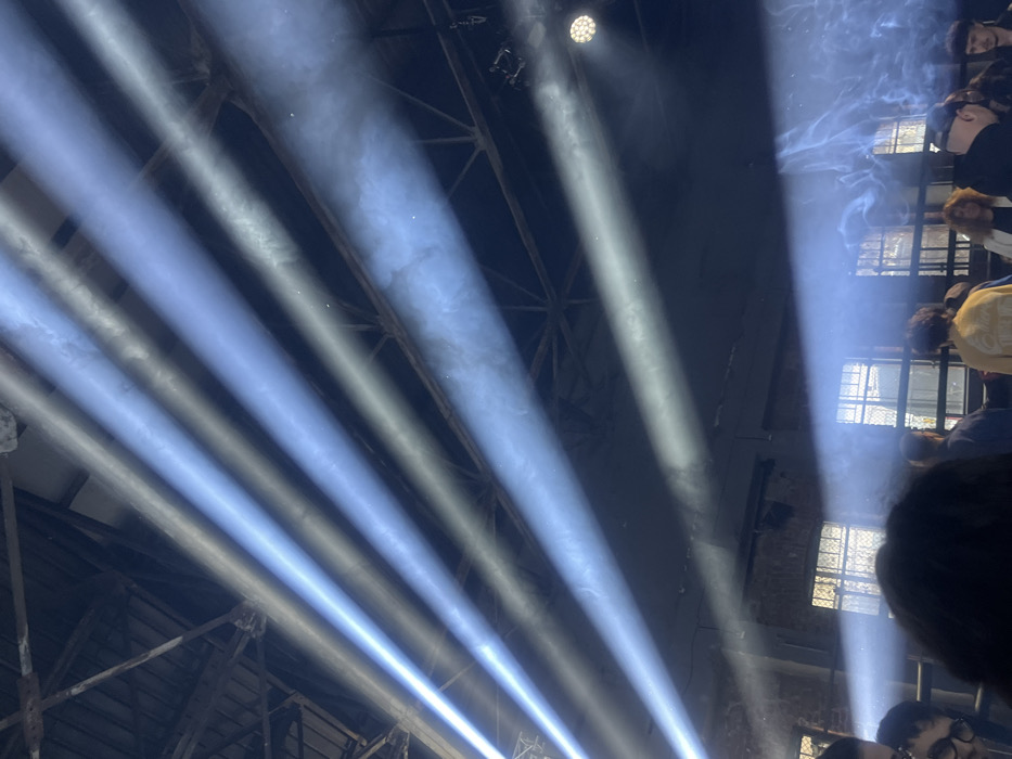 The image captures an indoor event scene within a repurposed industrial building in Sofia, Bulgaria. Bright, focused beams of artificial light, varying from white to light blue, diagonally traverse a smoke-filled or hazy atmosphere. These beams originate from sources positioned out of frame to the upper left and span across the high ceiling, which features exposed metal trusses and structural elements. A circular LED stage light is visible in the upper right quadrant. In the mid-ground and lower sections, a crowd of individuals is present, with heads and upper torsos partially visible. They are standing, facing forward, indicating an audience observing a performance or presentation. Several large, multi-paned windows with grid patterns are visible along a distant wall, allowing in ambient light. The architectural elements, including the industrial ceiling and windows, are characteristic of former factory or warehouse spaces converted into event venues, such as the Toplocentrala (Center for Contemporary Arts) in Sofia.
