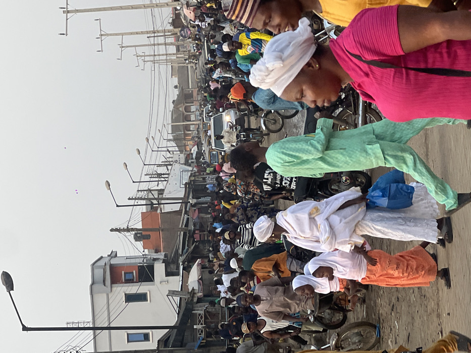 A bustling street scene unfolds with a dense crowd of people, many riding motorcycles. Overhead, power lines crisscross the sky, punctuated by evenly spaced streetlights. Buildings line the street, adding to the crowded feeling. The composition is dominated by warm tones of clothing among the crowd. The sky is overcast, casting a soft light across the scene.