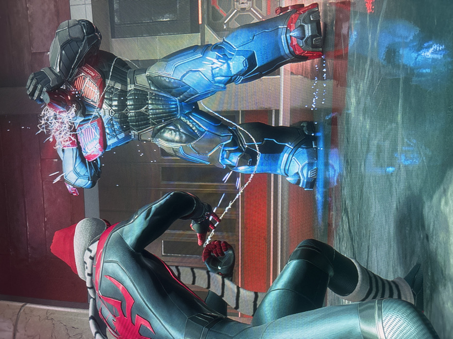 A vertical shot shows two comic book characters in a fighting pose. The character above is wearing a dark gray and blue suit with red accents. His head is surrounded by white web-like material. The character below wears a black suit with red markings and a gray hood. He holds a web line between his hands. The background features a red and silver wall on one side and a shimmering blue wall on the other.