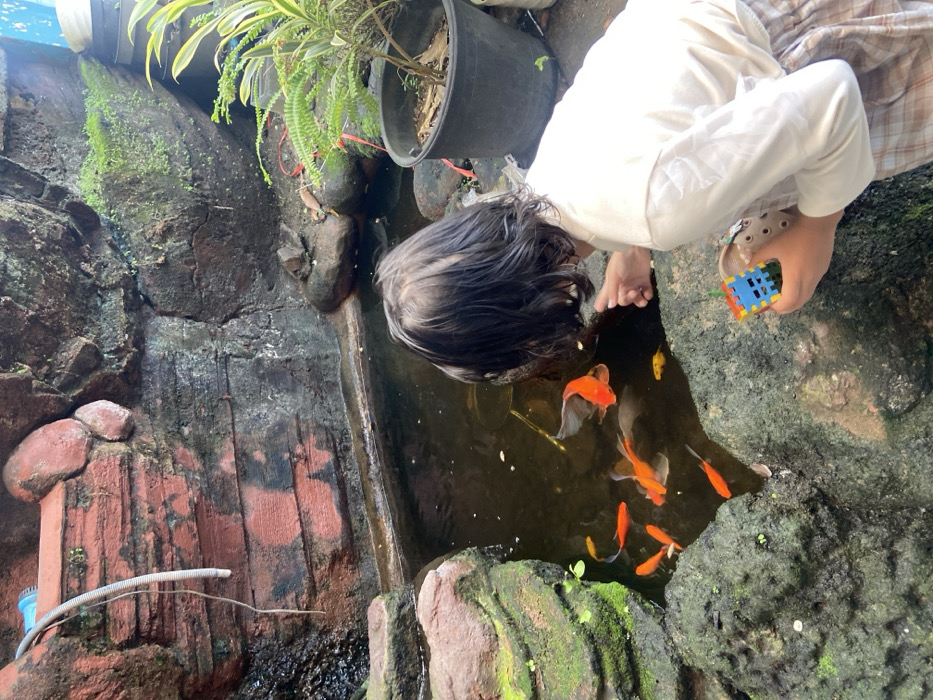 - "A young child with dark hair leans over a small pond filled with goldfish" by FM-htxI33, licensed under CC BY 4.0
