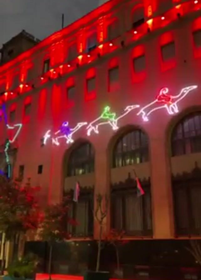building at night, lit with red lights. There are neon light figures of people riding animals, like camels, and a star, attached to the building. The building has arched windows with closed curtains and flags hanging on poles in front of them. There are trees in pots on the sidewalk in front of the building.