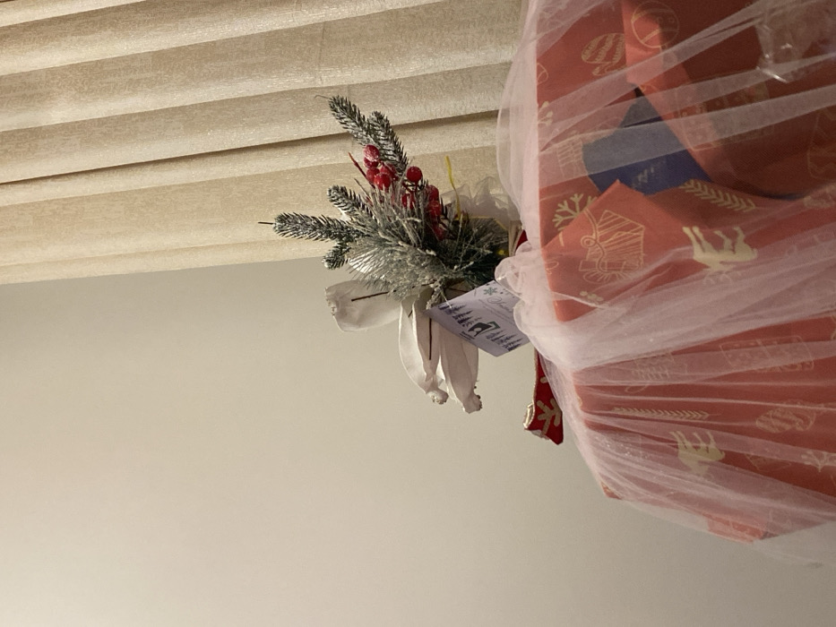 A stack of gifts wrapped in red paper with white reindeer and other holiday designs sits to the right, covered in white tulle. A decorative sprig of frosted evergreen branches with red berries and a tag hangs to the left of the gifts. The background consists of a light beige wall and a horizontal white slatted blind.