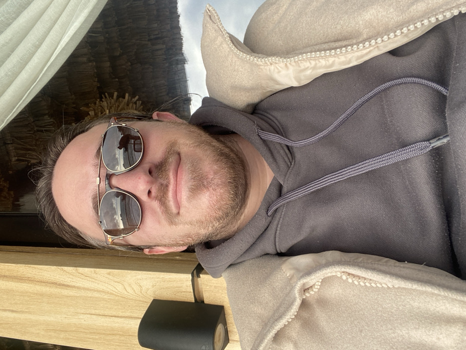 A male individual is captured in a close-up, front-facing photograph, likely a self-portrait, taken in Petrovac centar, Montenegro. He is wearing reflective aviator-style sunglasses with a tortoise-shell pattern and a gold-colored double bridge, obscuring his eyes. His expression shows a subtle smile. He has short brown hair and light brown facial stubble. His attire consists of a dark grey hooded sweatshirt with visible drawstrings, layered under a light beige or off-white collared jacket with a textured surface. The background elements suggest an outdoor or semi-outdoor location. To the left, a vertical light-colored wooden beam is visible, against which a black wall-mounted outdoor light fixture is affixed. To the right, a thatched roof structure and a section of white sheer curtain are present. The reflective lenses of the sunglasses show a clear reflection of a body of water, likely the sea, under a partly cloudy sky, with a visible shoreline and what appears to be a distant human figure or object at the water's edge.