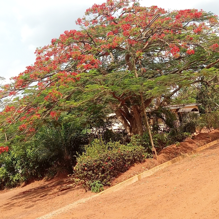The image depicts an outdoor environment in Nsukka, Nigeria. A large, mature Flamboyant tree (Delonix regia) dominates the left and central frame, featuring a sprawling canopy of green leaves and numerous clusters of vibrant red-orange flowers. Its substantial, multi-stemmed trunk is visible at the base. To the right of the tree's main trunk, a thin, light-colored pole stands upright. Beneath the tree and along the immediate right foreground, dense green vegetation, including smaller shrubs with reddish blossoms, lines the edge of a reddish-brown dirt road. A concrete curb partially separates this vegetation from the sloped dirt road, which extends from the lower left towards the upper right. In the background, partially obscured by the tree and other foliage, a light-colored building with a visible roofline and what appear to be arched windows is present. The sky above is bright with some cloud cover. No individuals or dynamic actions are depicted.