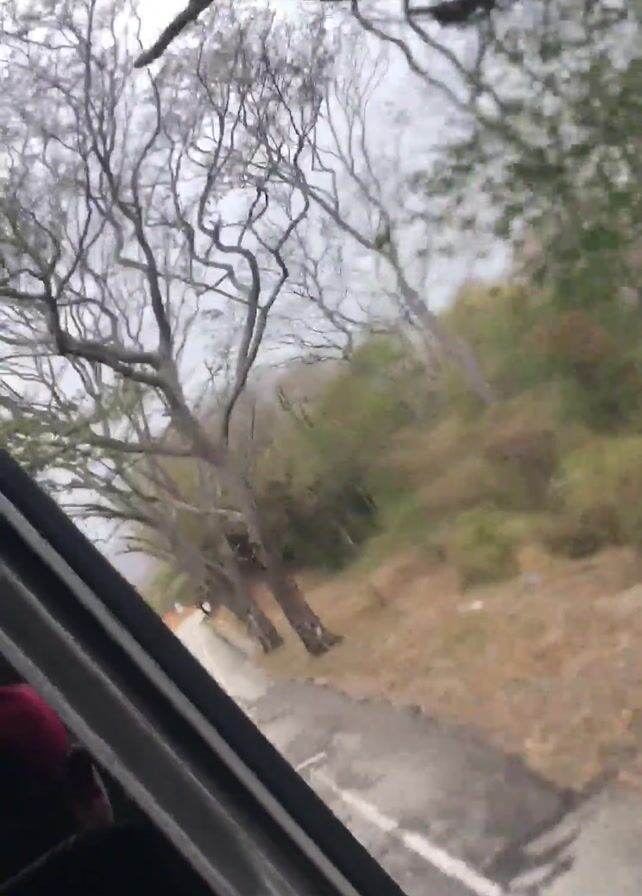view from inside a moving vehicle, possibly a bus or car, traveling along a road lined with trees and a steep dirt bank