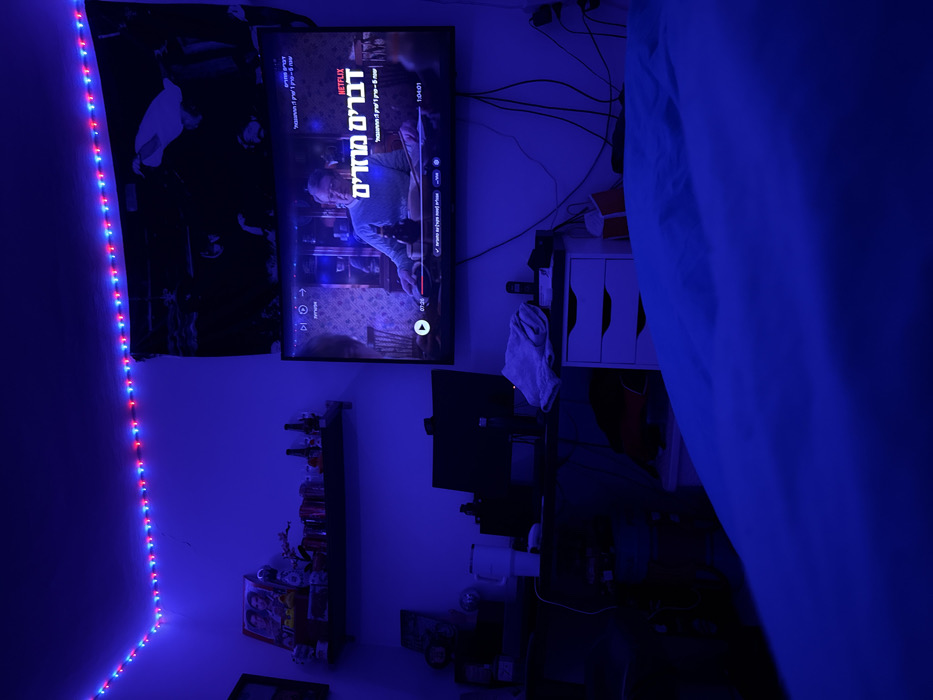 A room is illuminated with blue LED strip lights running vertically on the left wall. A television mounted on the wall displays a Netflix show in Hebrew. To the left of the TV is a black and white poster. Below, shelves display various items. A white drawer unit sits to the right of the TV with cables hanging above. The right side of the image is obscured by a large blue object, possibly a blanket or sheet.