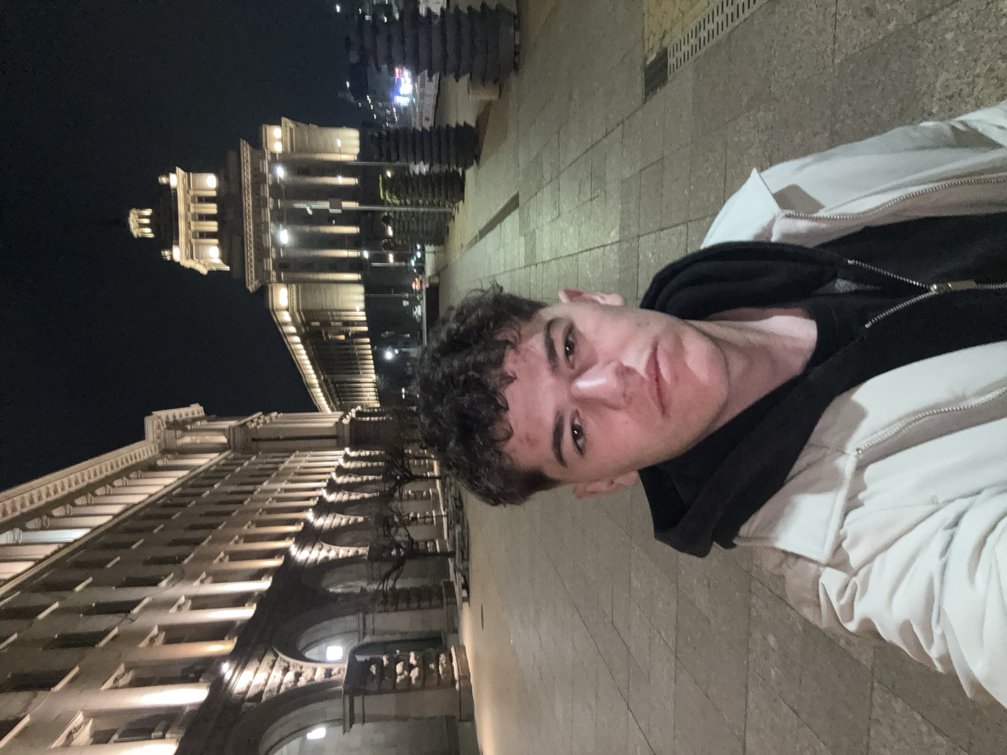 The image depicts a young male subject in a night-time setting in The Largo complex, central Sofia, Bulgaria. The subject, positioned in a selfie orientation, has dark, curly hair and a light complexion with visible blemishes on the forehead. He is wearing a black hooded sweatshirt beneath a light-colored, zippered jacket, and maintains a neutral expression while looking directly at the camera. The background features two prominent, artificially illuminated architectural structures. To the subject's left, a multi-story building with arched ground-level entrances and vertical facade lighting is visible, identifiable as a wing of the former Party House, now part of the National Assembly of Bulgaria. Further back and to the right, the Council of Ministers building is present, distinguished by its illuminated central tower and classical columns. The ground consists of a paved pedestrian walkway. A series of dark, multi-tiered planters or sculptural elements lines the right side of the pathway, while several bare trees are positioned near the base of the building on the left. The scene is illuminated by artificial light against a dark night sky, indicating the absence of natural light. No other individuals are visible in the frame.
