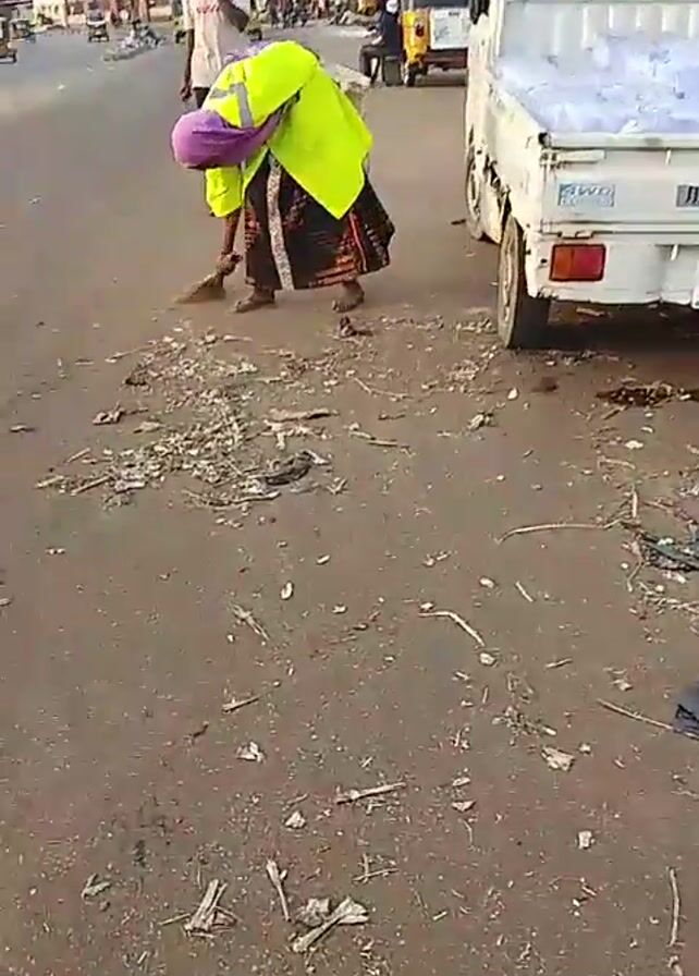 person in a neon green safety jacket and purple head covering sweeping debris from the street with a small broom. The person is wearing a long skirt and sandals. The street is littered with various types of trash. A white pickup truck is parked nearby. Other people are walking and vehicles are moving in the background. A hill is visible in the distance.