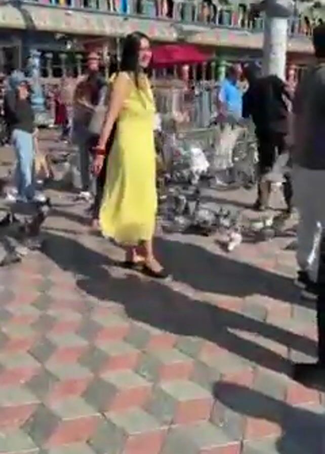 busy outdoor scene with many pigeons on a patterned red and grey brick floor. A woman in a bright yellow dress is the initial focus, surrounded by the birds. The camera then pans upwards to reveal a temple complex built into the side of a cliff, with a large golden statue of a deity standing prominently beside a long staircase. The steps are brightly colored and lead into the temple. People are walking around, taking photos, and interacting with the environment. The scene is well-lit, indicating it is daytime. The location appears to be a popular tourist destination or a place of religious significance.