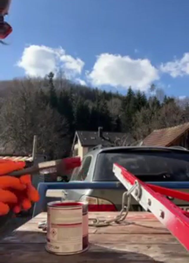 A woman is shown painting a red metal object outdoors, likely on a sunny day. She wears orange gloves and sunglasses and has dark hair in a braid. The object being painted appears to be part of some kind of apparatus or frame. A can of red paint is visible on the table next to her. In the background, there is a silver car, houses, trees, and a blue sky with scattered clouds. The surface she is working on appears to be a weathered wooden table.