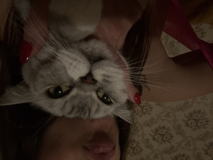 A person holds a fluffy, gray cat upside down, close to their face. The cat's eyes are wide and alert, with gray fur around its face. The person's mouth and chin are visible below the cat. Red nail polish adorns the person's fingers. A red ribbon is seen in the background, and floral wallpaper adds texture to the overall scene. The image appears to be taken indoors in dim lighting.