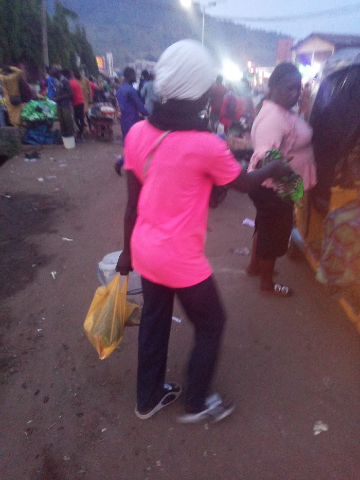In a bustling outdoor market, a person with a white head covering and pink t-shirt walks toward the right, carrying a yellow plastic bag. Dark pants and athletic shoes complete the attire. Beside, a woman in a light pink top and dark skirt stands near a vehicle. Other individuals and market activity fill the background under dim, overcast lighting. The ground appears to be a dirt or gravel road.