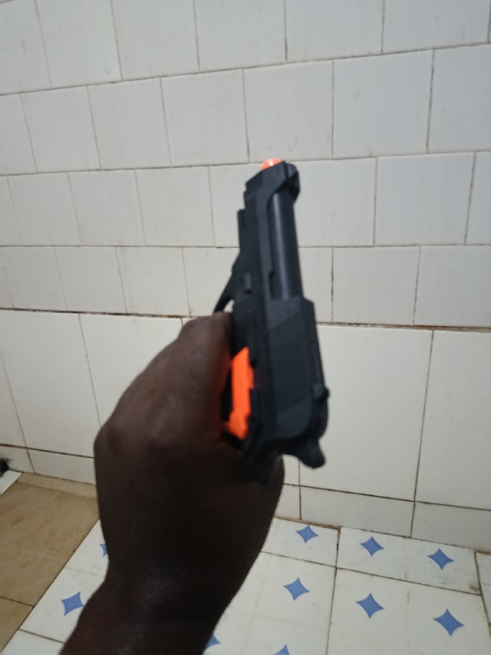 A hand holds a black toy gun, partially obscuring the view. The gun features an orange tip and accents, indicating it's a replica. The background consists of tiled walls, with a section of white tiles near the top and a section of alternating white and blue tiles on the floor. The lighting is bright, revealing the hand's dark skin tone and the gun's plastic texture.