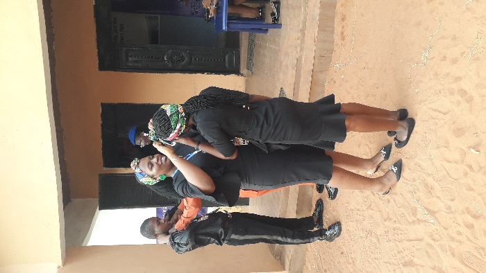 Two women stand embracing on a sandy surface, both wearing black dresses and traditional headwraps. One woman has her hand on the other's shoulder. A young boy wearing a tracksuit is visible in the foreground. They are outside a building with windows and doors, with a glimpse of people seated in the background. The scene appears to capture a moment of connection and celebration.