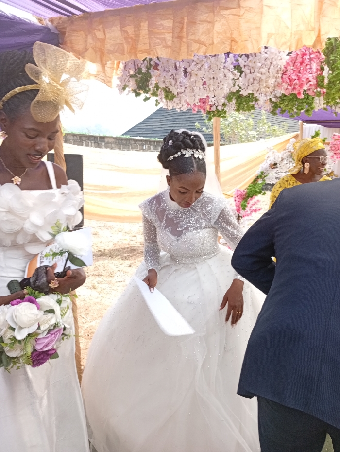 A bride in a sparkling white ballgown with long sleeves and intricate detailing stands with a white paper fan. To her left is a bridesmaid in a white dress adorned with flower accents, holding a bouquet of white and purple flowers. A man in a navy suit stands to the right, partially obscuring the view. Overhead, decorative fabric and floral arrangements provide a festive canopy. Another woman in a yellow and floral headscarf is visible in the background.