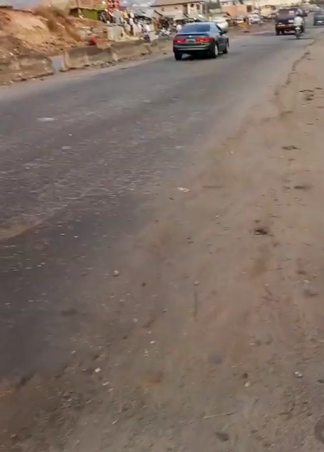 view of a paved road in a suburban area. The road surface is worn with patches and cracks. A yellow "keke", a type of auto-rickshaw, is seen traveling down the road, passing by the camera. Other vehicles, including cars and motorcycles, can be seen in the distance. A hill or mountain is visible in the background. Buildings line the edge of the road. There are people on the side of the road near the buildings. The overall lighting suggests it is daytime.